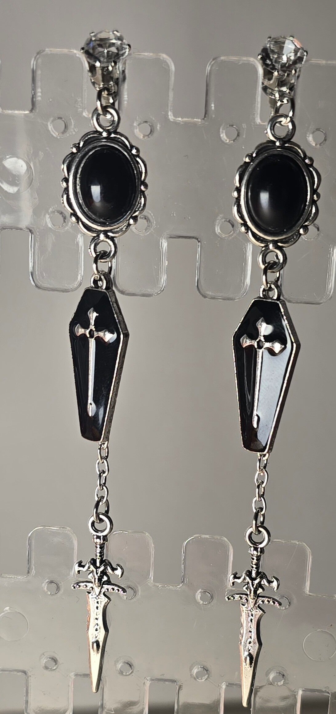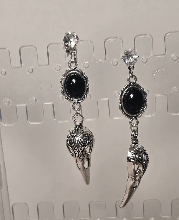 These handmade gothic earrings blend dark elegance with bold symbolism. Featuring miniature coffins, intricate bird skull and slender sword charms, each piece is for those who love the mysterious and the dramatic. Lightweight yet striking, they add a touch of shadowy beauty to any look—perfect for gothic fashion, alternative style, or anyone drawn to the art of the macabre.